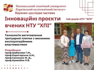 Лабораторну партію тротуарної плитки виготовлено на базі нашого університету та використано для облаштування тротуарного переходу на території кампусу НТУ “ХПІ”.